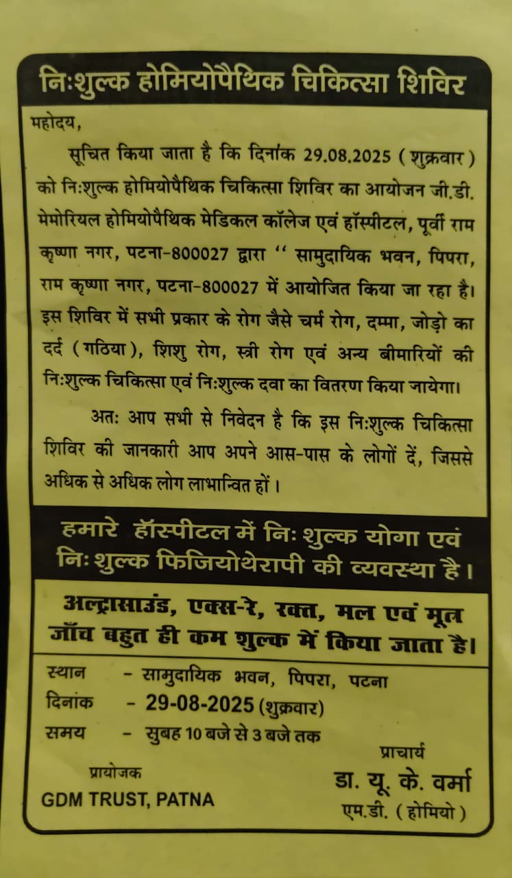 East Ramkrishna Nagar, Near New Bypass, Patna - 800027, Bihar Recognized by the CCH/ NCH/ Ministry of AYUSH (Govt. of India), New Delhi Affiliated to BRA Bihar University, Muzaffarpur, Bihar